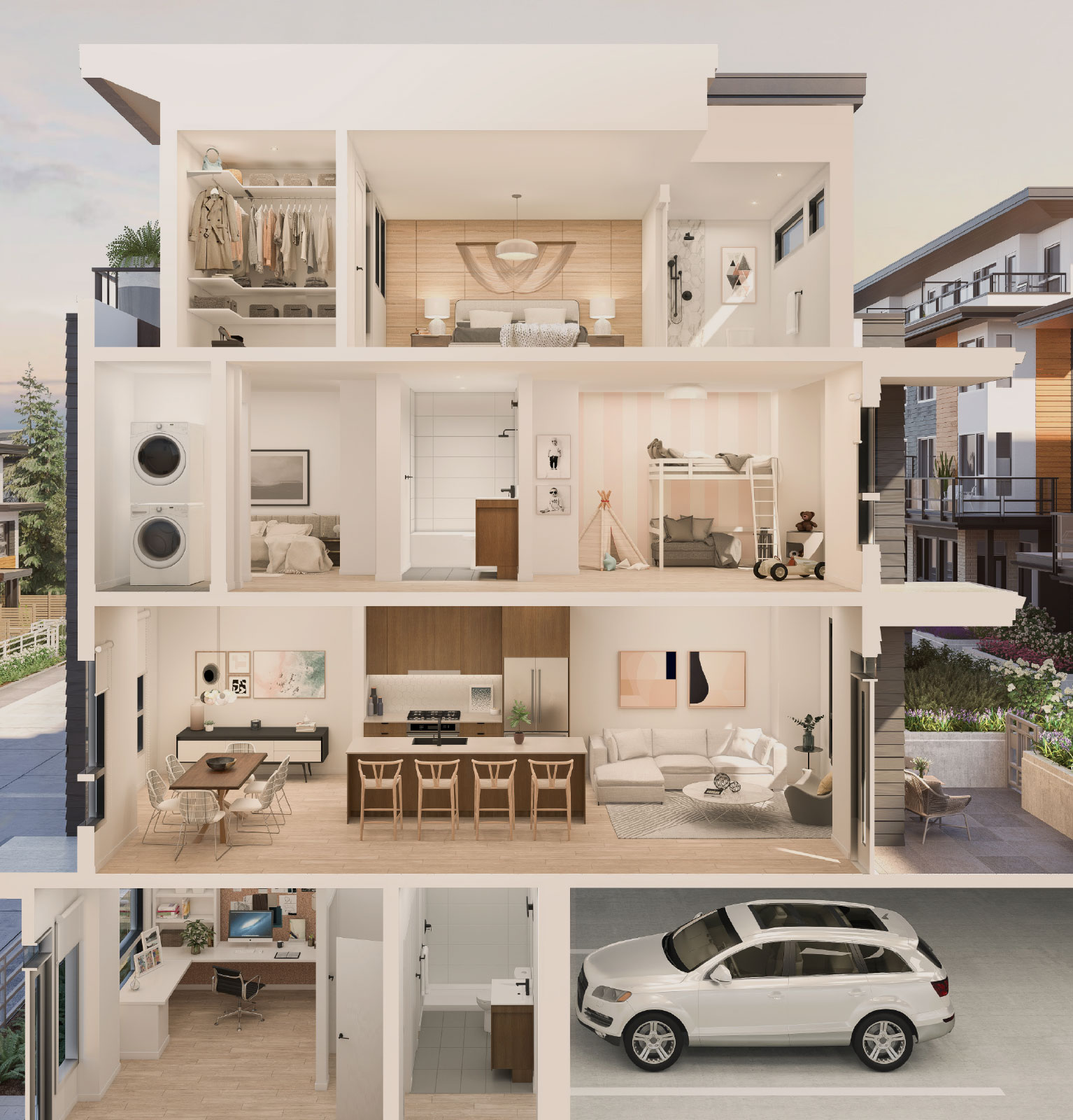 Designed for you to enjoy more everyday ease, homes include functional, open-concept layouts and clever storage solutions. Scandinavian-inspired interiors combine design-forward details with a neutral colour palette to create a warm feeling of home. Select homes offer direct access to the secure underground parkade and all homes are constructed to LEED Gold sustainability standards, creating more comfortable and smarter living spaces for growing families.